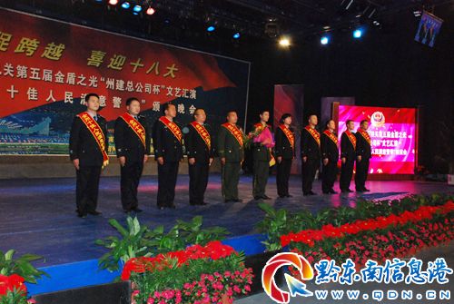 11月2日晚,由黔東南州委宣傳部、州公安局主辦的黔東南州公安機關第五屆金盾之光文藝匯演暨第二屆“十佳人民警察”頒獎晚會在州電視臺演播大廳舉行。黔東南州委副書記楊華昌,州委常委、州政法委書記、州公安局局長王家黔出席晚會并為獲獎者頒獎。雷山縣公安局局西江派出所民警楊剛經過層層評選,最終獲得了“十佳人民警察”榮譽稱號。