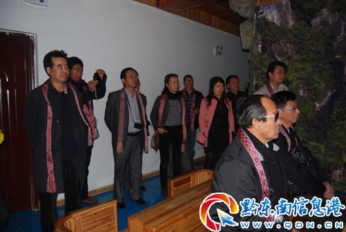 圖為國土資源部專家、中國地質(zhì)大學(xué)教授田明中在臺(tái)江縣人民政府縣長成兵的陪同下檢查驗(yàn)收博物館