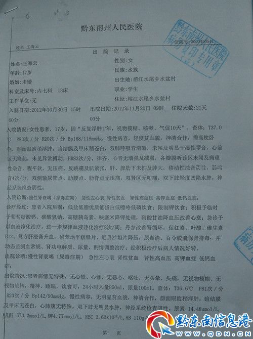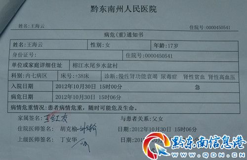 記者在醫(yī)院了解到,王海云同學(xué)身體狀況現(xiàn)已處于尿毒癥晚期,醫(yī)院已下發(fā)病危(重)通知書,需急需換腎治療。