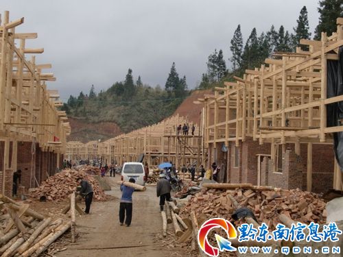 目前,已完成14000平方米地基平整工程,45戶建房木料全部到位,現有施工隊15個,打好房架42棟,豎房40棟,磚到位35戶,瓦片到位35戶。