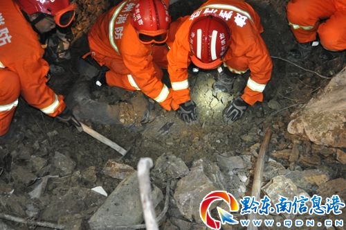 18時37分,消防官兵到場后發(fā)現(xiàn)現(xiàn)場一片狼藉,經(jīng)詢問已救出1名被困人員,另1名被困人員因被埋位置不清楚正在挖掘?qū)ふ抑小3醪搅私猬F(xiàn)場情況后,指揮員立即下令開展救援。消防官兵對現(xiàn)場實施警戒,防止發(fā)生次生災(zāi)害,因車上挖掘工具不夠,消防官兵向周圍群眾借鋤頭、鐵鍬等工具進行挖掘救援。