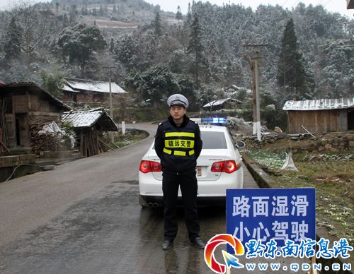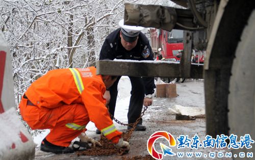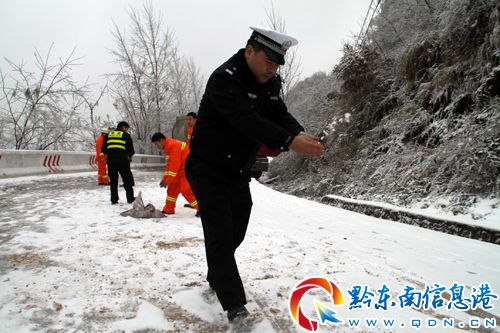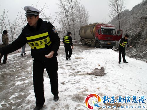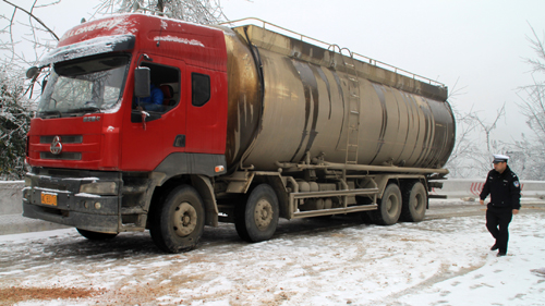大罐車受困處為鎮臺線最高點——古樓坪山埡處。受29日強降溫影響,該處路面結冰,外籍貨車不諳地形又不理會交警大隊警示牌警告而采取相應措施,故造成側滑。只見鎮遠交警一面進行交通管控,一面和消防官兵一道撒溶冰鹽、鋪防滑沙等,絲毫不顧刺骨寒冷,全心全力投入到救援當中。經一個多小時的緊張施救,10時30分許,大罐車成功脫險。