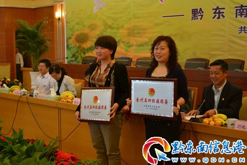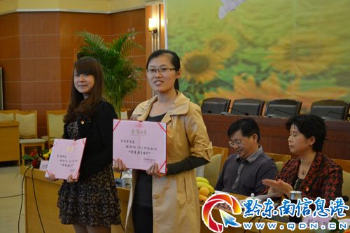 會上,州委副書記楊華昌、州人大常委會副主任石干昌為榮獲2011年全州“五四紅旗團(tuán)委”代表:州建總公司團(tuán)委、麻江縣宣威鎮(zhèn)團(tuán)委頒獎(jiǎng);州人大常委會副主任潘玉鳳、州人民政府副州長劉曉春為榮獲2011年度全州“五四紅旗團(tuán)支部”代表:丹寨縣龍泉鎮(zhèn)卡拉村團(tuán)支部、從江縣呵護(hù)地球環(huán)保志愿者協(xié)會團(tuán)支部頒獎(jiǎng);州政協(xié)副主席楊勝勇、凱里學(xué)院院長曾羽為榮獲2011年度全州優(yōu)秀團(tuán)干部代表:黔東南州民族職業(yè)技術(shù)學(xué)院護(hù)理系團(tuán)總支書記高媛、施秉縣甘溪鄉(xiāng)團(tuán)委書記武芳芳頒獎(jiǎng);原團(tuán)州委書記何蔓麗、原團(tuán)州委副書記任家洪為榮獲2011年度全州優(yōu)秀共青團(tuán)員代表:凱里學(xué)院學(xué)生會主席、09級文秘一班馬超、凱里市第三中學(xué)高二(2)班羅學(xué)嬌頒獎(jiǎng)。