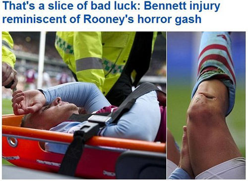 從《每日郵報》給出的圖片來看,雖然傷口沒有鮮血涌出,但長長的口子和傷口的深度卻讓人倒吸了一口涼氣。隨后維拉隊醫(yī)對其進行了簡單處理,本內特也被擔架抬下,然后直接送往醫(yī)院進行縫針。究竟這道恐怖的傷口是何所致,《每日郵報》認為有可能是被場邊廣告牌劃傷,也有媒體認為是被貝爾的鞋釘踹到。