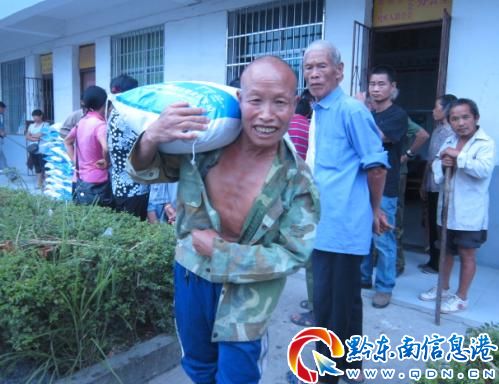 64歲的五保戶楊德燦得到救濟糧笑了