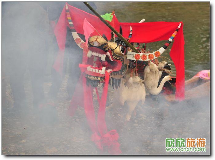 在一陣激烈的炮竹硝煙中昂首望天的龍舟龍首。金色的龍頭上長著一對兒長長的貌似牛的犄角。喜慶味道壓過威猛。還有大紅色的綢布帶纏在犄角上以壯聲色。