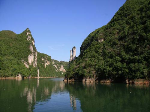 上舞陽一段,東起施秉城西的觀音崖,西至黃平的印地壩,全程25公里,乘船游覽全程約需4個小時。由雄奇的觀音峽、舒緩的望夫峽和清幽的無路峽三個峽谷組成。由于森林植被保護很好,因此這里的特點是五多:灣多、奇峰多、猴多、鳥多、竹木多。