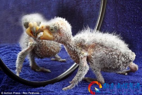 不知所措:納爾遜對鏡子里它的與眾不同的外貌感到疑惑,據說它看起來像是外星人和烤雞雜交產生的后代
