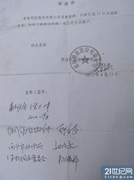 青海明膠公司向附近居民所做承諾書,同時,城北區政府、西寧市環保局、生物園區管委會的領導作為監督人簽字。