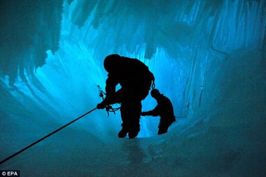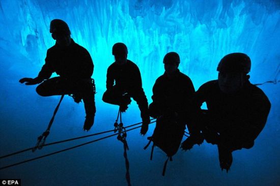 藏于地下的奇觀:英國皇家海軍陸戰隊士兵進入南極洲偏遠島嶼羅瑟拉島的一個冰洞。