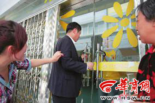 一家長敲著幼兒園的門,要找當事老師,一旁的家長勸他別沖動本報記者李贏攝