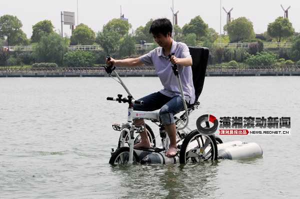 曾健是湖南師范大學工學院機械系的學生,四個月前,他突發(fā)奇想,要是發(fā)明出一種能夠在水面行走的自行車,該是多么好的一項娛樂設置。于是,他聯合其他4位同學共同研究設計,發(fā)明了這樣一款“水陸兩棲菱形車”。