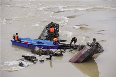 記者在垮橋現場看到,這個約120米長的兩墩三孔的石拱橋已經全部垮塌,只剩下江岸兩邊的橋梁結構,垮塌斷裂的橋墩和橋面仍然呈“一”字狀橫在昌江河里,一艘小型沙船已經整體翻了過來,半截船體被埋河里。在范固橋下游,還有幾艘被大水沖下來的沙船。一些救援人員仍在垮橋現場搜救落水人員,還有一些人則在下游尋找。