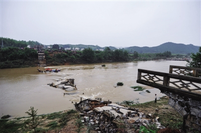 連接余坪鄉與梅仙鎮的這座橋名為范固橋。橋墩被巨大的山洪、從上游陸續沖下的三艘挖沙船及樹木等各類漂浮物撞擊。當地村民稱,大橋橋體主要被從上游金田沙場漂下來的挖沙船撞傷。