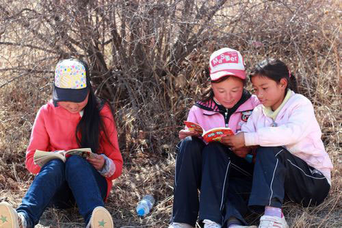 拿著捐贈書籍開心地坐在山上閱讀
