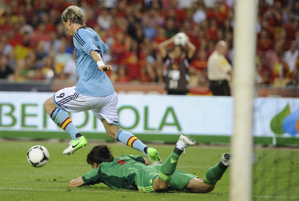 上半時比賽開場,中國隊打得并不保守,開場后于海和張琳芃就在兩側尋找突破機會。第4分鐘,趙旭日大禁區前沿嘗試遠射打偏。2分鐘后,大衛-席爾瓦接阿韋羅亞傳球右肋大禁區前沿左腳低射偏出近角。第7分鐘,鄭智前場逼搶從阿隆索腳下斷球,郜林不調整直塞,鄭智突破了出擊的卡西利亞斯,在禁區左側扣過阿爾比奧爾后起腳可惜打在邊網偏出。第9分鐘,大衛-席爾瓦左路橫傳,內格雷多小禁區邊緣包抄推射被曾誠用身體擋出,趙鵬隨即大腳解圍。