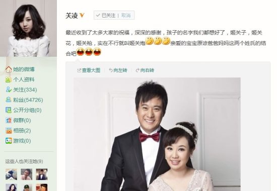 昨日22時14分知名博主長春國貿爆料稱關凌已懷孕數月,目前在家休養待產。老公姬云飛也減少工作照顧愛妻。為此關凌今天10時54分承認懷孕,并已準備給孩子取有趣的名字了,”最近收到了太多大家的祝福,深深的感謝,孩子的名字我們都想好了,姬關子,姬關花,姬關槍,實在不行就叫姬關炮親愛的寶寶原諒爸爸媽媽這兩個姓氏的結合吧。“
