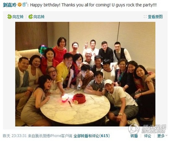 6月27日是梁朝偉50歲生日,劉嘉玲特意舉辦party為老公慶生,一眾好友林青霞、張學友、鐘鎮(zhèn)濤、杜德偉、葉童夫婦等紛紛到場慶祝。劉嘉玲在騰訊微博直播了派對現(xiàn)場,并寫道“Happy birthday! Thanks you all for coming! U guys rock the party!!!”。