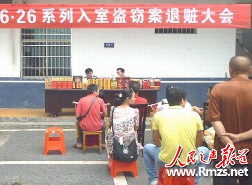 8月14日下午,湖南衡陽縣公安局西渡中心派出所院內人潮涌動,熱鬧非凡,"6.26"系列盜竊案退贓大會在這里如期舉行,前來領取被盜財物的失主紛紛以燃放鞭炮、贈送錦旗的方式,表達對民警的謝意。