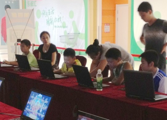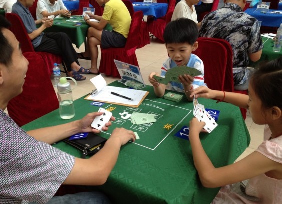 或許由于商場四樓是孩子樂園的緣故,本次參賽玩家中很多都帶著孩子來到賽場,現場的體驗區簡直就成了孩子樂園。大人們除了把孩子安放在體驗區外,也有抱著孩子入場的,甚至有一家三口齊上陣的,分工明確,老爸參賽,老媽計分,孩子負責加油。最多的時候在同一桌比賽中,竟然同時出現了兩對一家三口。青島公開賽專題頁面:http://www.jj.cn/special/2012match/qingdao/