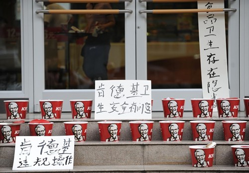 事件發生在位于京漢大道肯德基汽車穿梭餐廳。昨日下午4時許,記者趕到現場時,當事肯德基店門前已經放置了22份肯德基外帶全家桶,整齊擺放在門口臺階上。一同擺放的,還有幾塊手書的“肯德基操作違規、肯德基衛生安全有問題”的紙牌子。