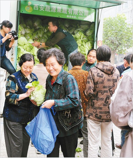 為了解決菜農們的難題,市商務局就帶領西安蔬源果蔬有限公司負責人到草灘農戶的地里,收購了12.5萬公斤白菜,免費發放給市民。