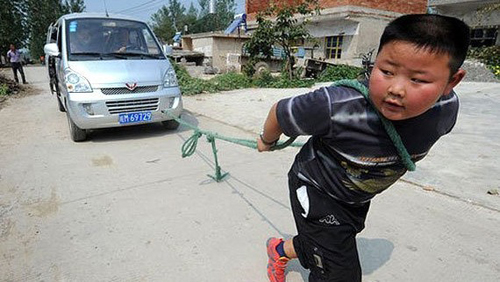 近日網(wǎng)絡(luò)上出現(xiàn)一個(gè)帖子稱,安徽一位名叫楊金龍的男童今年才7歲,卻能將沉重的板車(chē)轱轆舉到下巴,還能背起100公斤重的壯漢,簡(jiǎn)直能“秒殺同齡的阿諾施瓦辛格”。看到圖片后有的網(wǎng)友稱真被“秒殺”了,有的則很懷疑。2012年9月23日,在滁州市鳳陽(yáng)縣西泉鎮(zhèn)新建村,記者親眼看到楊金龍用繩子拖走1.85噸重的汽車(chē)后,也被當(dāng)場(chǎng)“秒殺”了。