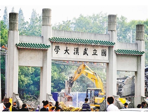 “老武大的牌坊”,是游覽武大時必留影之處。9日下午2點,隨著“轟”一聲沉悶的響聲,一部挖掘機僅2分鐘便完成了任務,一座有20年歷史的武大標志性建筑便不復存在了。