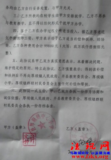 在網絡曝出《開縣村民2次到縣政府請愿,禍首是縣委書記李殿勛?》之后又曝出《重慶市開縣縣委書記李殿勛是吹牛書記》,得到開縣相關部門重視,開縣教委多次和向可富協商確定,無奈的向可富正式將村小交由厚壩鎮小學負責。11月2日,由開縣教委出面,向可富和厚壩小學簽訂協議,16日,向可富拿到“補償扶持款”。