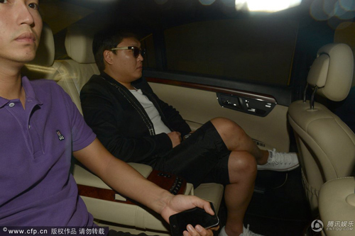 晚上約8時,換了一身火紅西裝的PSY乘車前往灣仔碼頭,在車上摘下招牌黑超的他似乎極疲倦,其后他戴回黑超下車,見記者在場他笑著揮手,之后便上了游艇,夜覽香港景色。