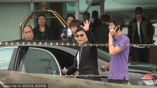 成為全球紅人的PSY,連日來馬不停蹄到處飛,29午他乘座私人飛機到港,盡顯紅人的派頭。戴上太陽眼鏡的PSY,還以全黑打扮示人,甫下機的他,不但雙手插著褲袋步往座駕,還向于私人飛機停機坪外守候的傳媒揮手示意,十分親民。