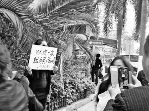 據該讀者介紹,這個女子當時站在電信大樓前,在她的周圍聚集了很多圍觀的人。“我在那站了有10多分鐘,就有3個人上前與她擁抱,其中有一個男生給了那個女子10元,但是看起來有點害羞,不敢跟她擁抱,就站在她的旁邊跟她一起合影。”發微博的讀者打趣地說道。