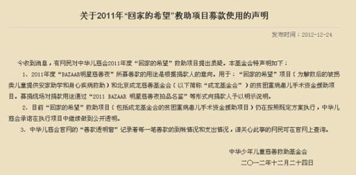深陷“洗錢”丑聞的兒慈會12月24日在其官網(wǎng)上回應(yīng)了關(guān)于2011年“回家的希望”救助項目募款使用的說明,并表示中華兒慈會官網(wǎng)的“善款透明窗”記錄著每一筆善款的到帳情況和支出情況,請關(guān)心此事的網(wǎng)民可在官網(wǎng)上查詢。成龍基金會則發(fā)聲明表示基金會一直以零成本在為其他捐款人提供服務(wù),沒有一例將善款用于行政開支。