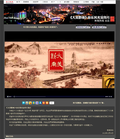 為響應十八大提出的“生態文明 美麗中國”的號召,向全世界網民展現黔南布依族苗族自治州優美的自然風光和人文風情,2012年12月31日,由黔南熱線策劃制作的《大美黔南》音樂風光宣傳片出爐。
