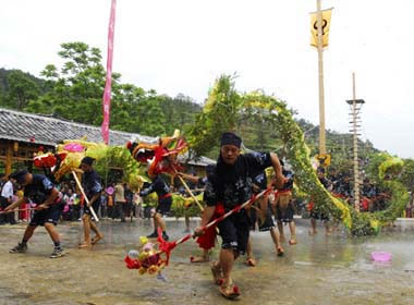 做一條龍要用七七四十九天,以后每次裱糊都規(guī)定九天完成。因?yàn)槊先艘?ldquo;九”為大,同時(shí)也有九龍治水的說法。在舞火龍當(dāng)中,請水、舞龍、放水燈是不可缺少的環(huán)節(jié)。請水就是把龍從水中請出來,也請龍?jiān)趤砟曛卸嘟o雨水。這是舞火龍最隆重的儀式。在請水時(shí),誰家有嫩娃娃,由母親背著從龍身下穿過,就會百病不生,健康成長。舞龍,就是龍請出來后,到各地舞動(dòng),時(shí)而上下翻騰、時(shí)而爭奪戲珠,通體透亮的龍身,從龍口中吐出熊熊烈火,龍身兩邊有敲鑼打鼓的、抬水的、端蠟燭的,氣勢和陣容慰為壯觀。