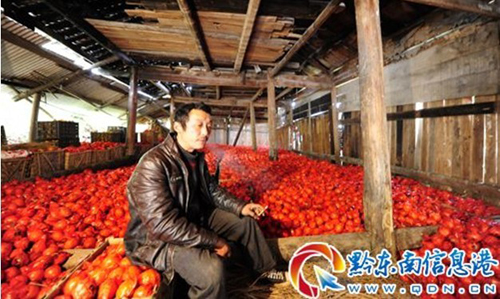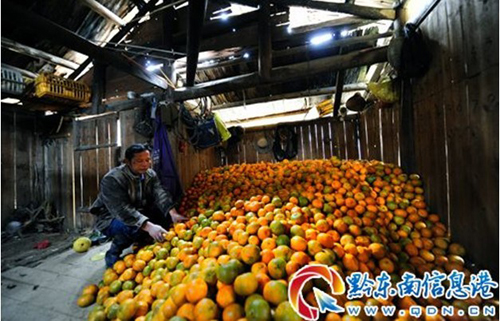 12月8日,從江縣雍里鄉兩料村的果農大戶劉向陽坐在他囤放椪柑的果棚里。眼下本來是椪柑果農大量銷售的季節,但椪柑果農劉向陽還有七萬多斤椪柑無人問津。“去年十多萬斤的椪柑只買到四、五萬塊(元)錢”,看著一大堆的椪柑沒有銷路劉向陽感到很憂愁。