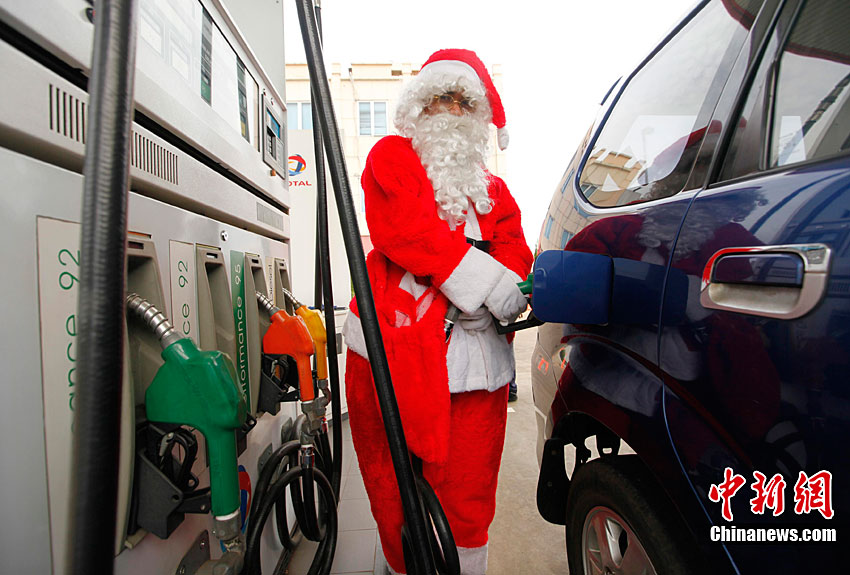 圣誕老人為過往車輛加油洗車