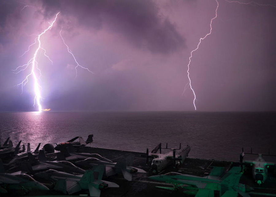 美航母通過馬六甲時遭遇壯觀雷暴