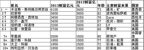 2月28日胡潤研究院發布《2013雅居樂海南清水灣胡潤全球富豪榜》,墨西哥人斯利姆以財富4100億元第二次成為“胡潤全球首富”,巴菲特和Zara西班牙創始人奧特加排名第二、第三位,比爾蓋茨跌出前三位置。亞洲富豪數量最多,達到608位,其次是美洲440位,歐洲324位。中國超越了美國成為全球資本市場創造十億富豪最多的國家,富豪數量達到212人;美國數量211人。