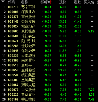 受新國五條細則影響,房地產股今日領跌兩市,截至10:52,板塊大跌6.78%,個股現跌停潮,金地集團、保利地產、招商地產等16只股跌停,萬科跌逾9%,地產板塊僅3股飄紅。