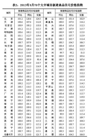 10月22日 國家統計局今日發布2013年9月份70個大中城市住宅銷售價格變動情況。數據顯示與上月相比,70個大中城市中新建商品住宅價格上漲的城市有65個。環比價格上漲的城市中瀘州漲幅最高,為1.9%。與去年同月相比,70個大中城市中新建商品住宅價格下降的城市有1個,上漲的城市有69個,北京上漲幅度最高,為20.6%。
