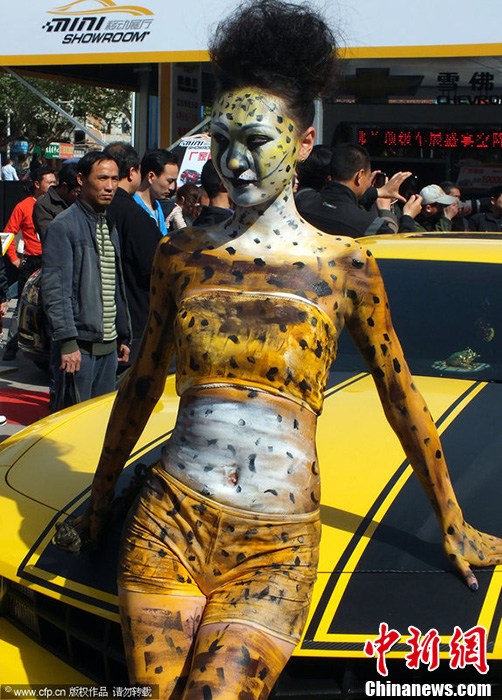 人體彩繪“豹女”“貓女”助陣宜昌車展(圖)