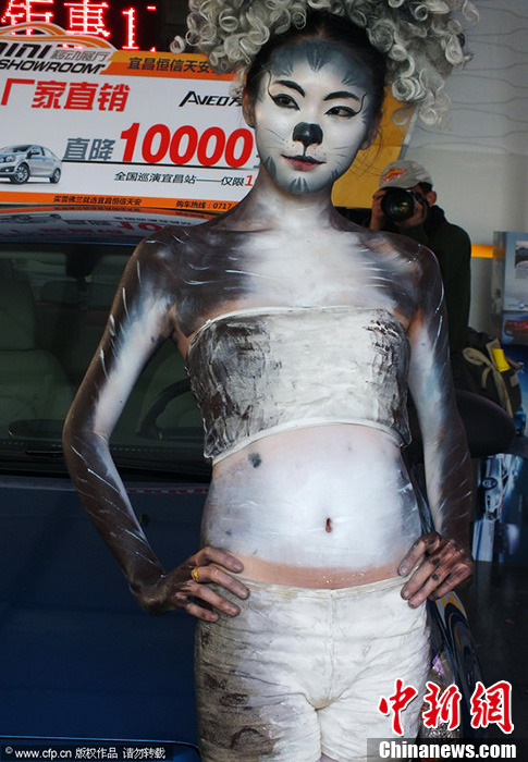 2013年4月6日,湖北宜昌市某商家在萬達廣場展銷雪佛蘭汽車,商家推出人體彩繪,美女變身“豹女”、“貓女”來吸引眼球招攬顧客,很多市民直呼“豹女”“貓女”雷人。