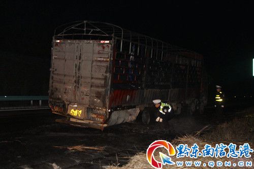 據介紹,當日凌晨2時51分,黔東南高速大隊六中隊值班民警接到從江縣110指揮中心轉警稱,廈蓉高速下行線雙江匝道附近有一輛貨車自燃,請出警援救。中隊負責人立即帶領民警趕赴事發現場,同時,請求黎平縣消防大隊和從江高速路政大隊出警支援。