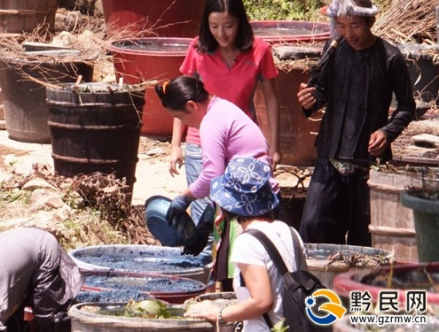 《文明密碼》欄目攝制組在拍攝岜沙群眾人工染布