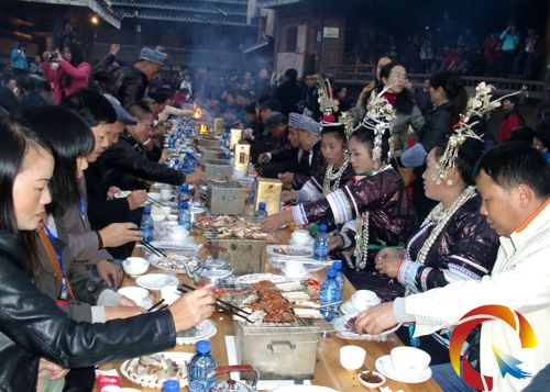 長桌宴盛上了風情濃郁的烤香豬、腌魚、腌酸菜等當?shù)靥赜忻朗�,這些美食皆由當?shù)孛耖g名廚現(xiàn)場加工烹制而成。賓主千人同桌,抓噴香糯飯,吃從江香豬,品正宗煨酒,嘗農(nóng)家腌魚,敘新老情懷,聊古樸民風。