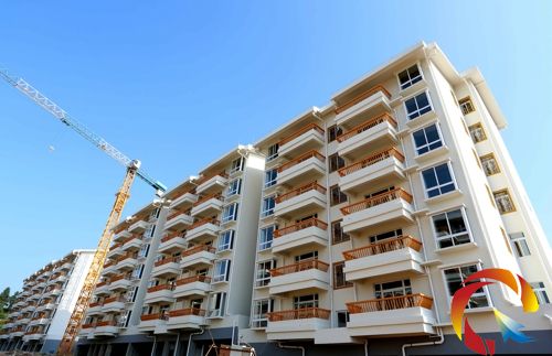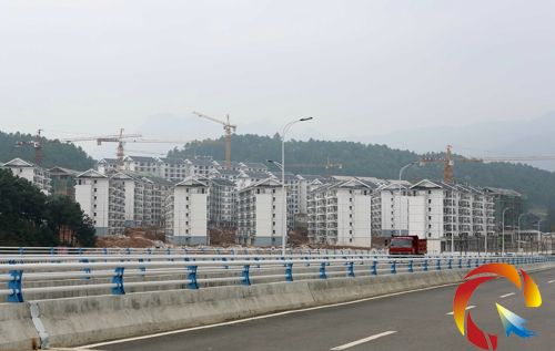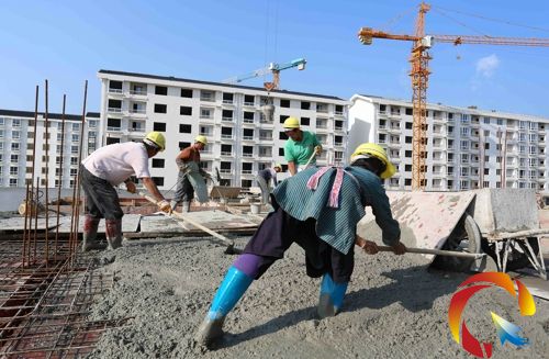 建筑工人在即將竣工的扶貧生態移民房前施工