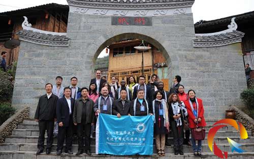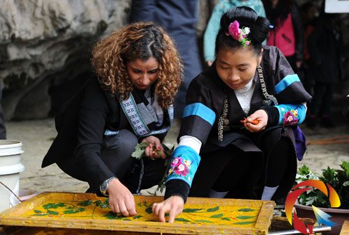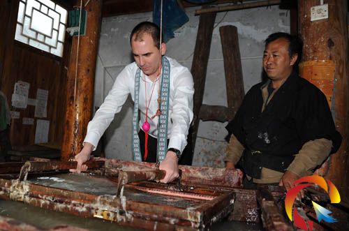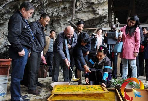 參加“2013年駐華使節(jié)走進(jìn)中國文化遺產(chǎn)”活動的各國使節(jié)在丹寨縣南皋鄉(xiāng)石橋村感受古法造紙制作技藝