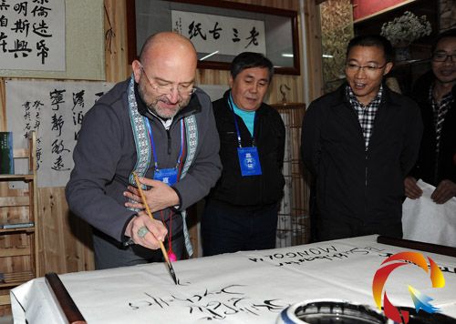 11月11日,塞舌爾國大使在參觀古法造紙制作技藝后題字