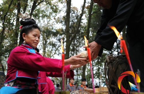 祭師在祭尤節的祭祀儀式上向前來參加祭祀儀式的苗族村民分發祭品